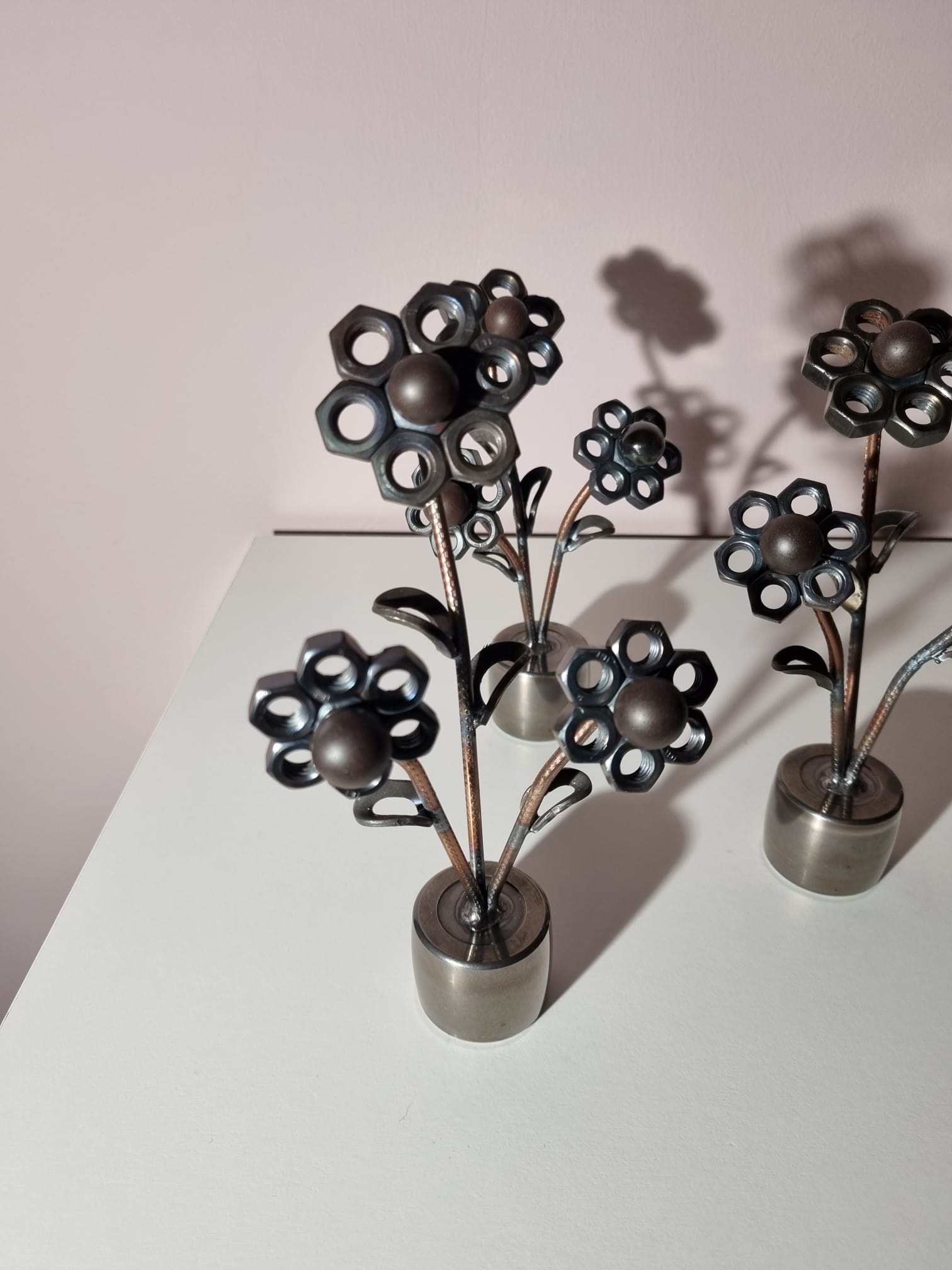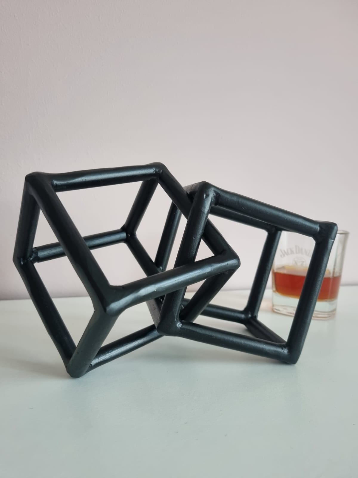 Na biurku męża znajduje się wyjątkowy stalowy obraz abstrakcyjny, wykonany ręcznie na życzenie żony z okazji jego urodzin. Jest to prezent, który nie tylko zdobi biurko, ale także symbolizuje miłość i ich wspólne życie. Zatytułowane "Nasz Świat" abstrakcyjne dzieło składa się z dwóch przenikających się sześcianów. Gładka stalowa powierzchnia emanuje elegancją i nowoczesnym designem, a abstrakcyjna forma rzeźby pobudza wyobraźnię i zachęca do interpretacji.