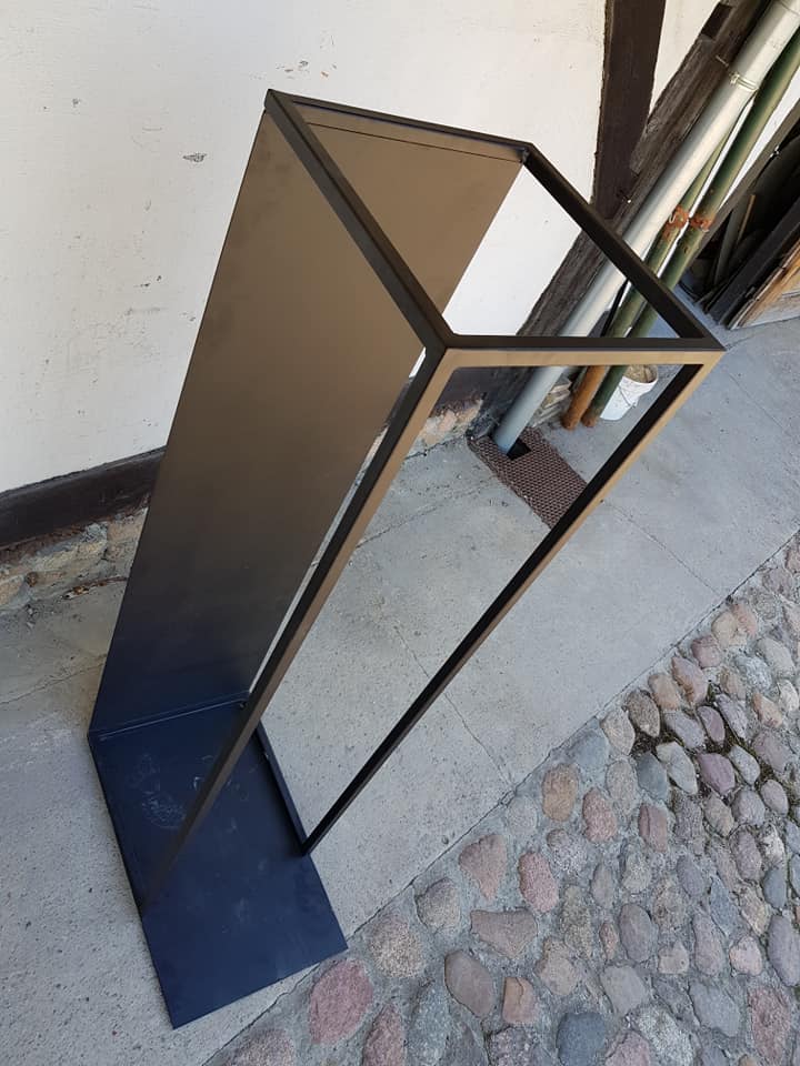 Stojak ma wysokość 150 cm i szerokość 30 cm. Rama stojaka wykonana jest z profili stalowych o wymiarach 2x2 cm, co zapewnia jej stabilność i wytrzymałość. Tył i spód stojaka wykonano z blachy stalowej o grubości 5 mm, co dodatkowo wzmacnia jego konstrukcję i odporność na uszkodzenia.