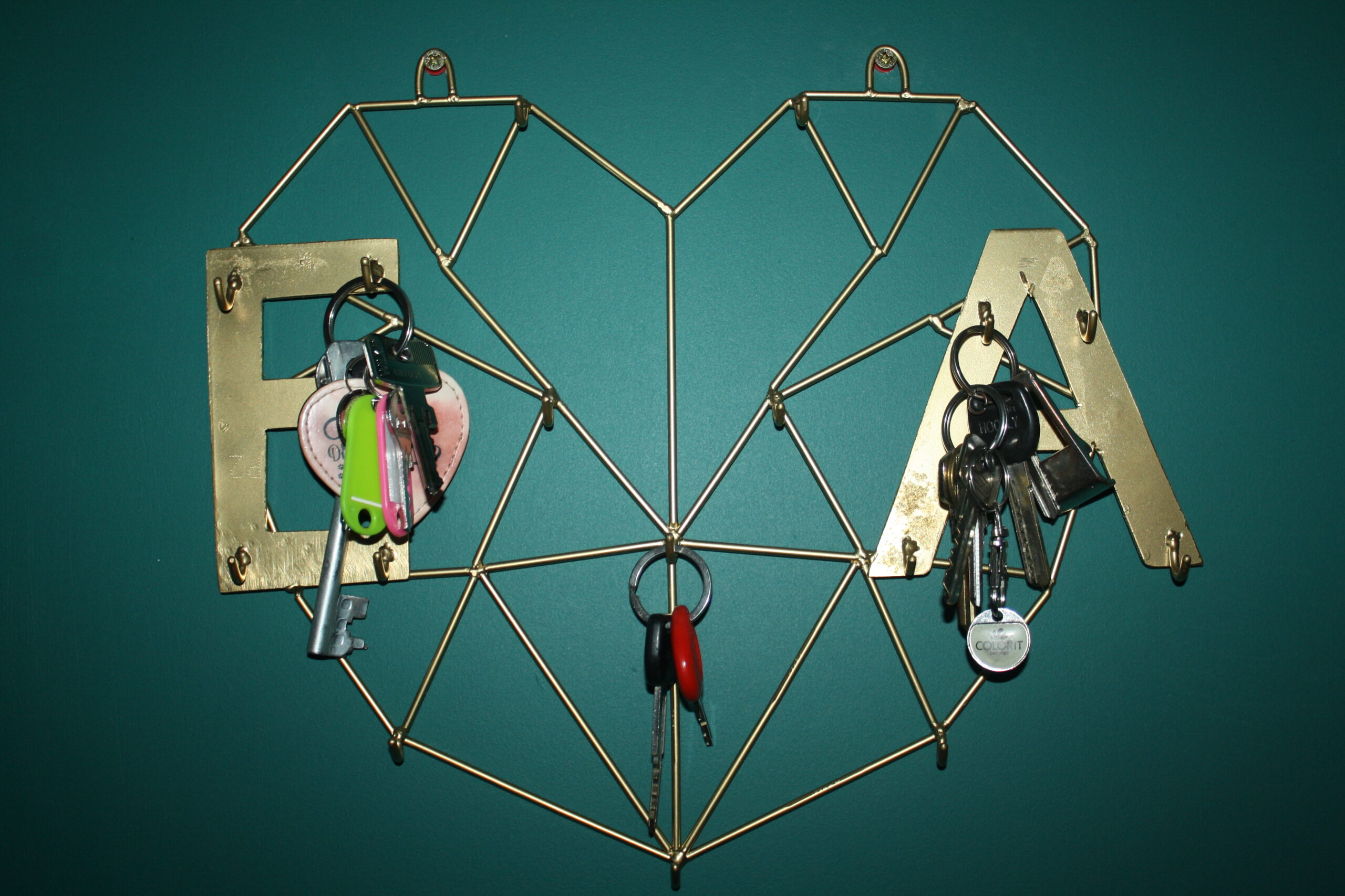 Praktyczny wieszak na klucze z inicjałami E i A, wykonany z druta spawalniczego na wzór siatki. Idealny sposób na uporządkowanie kluczy w przedpokoju. Dostępny w różnych rozmiarach i kolorach.