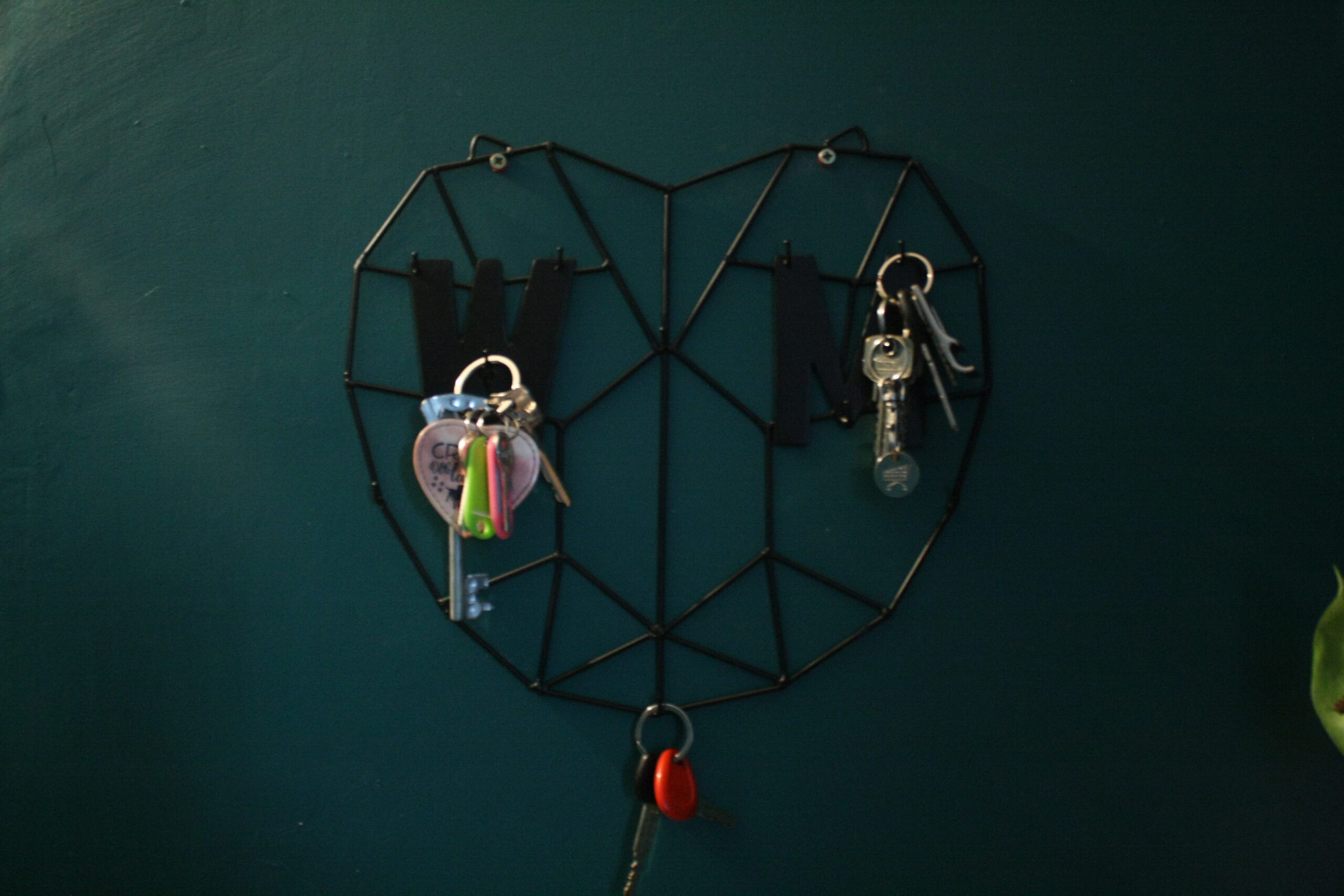 Praktyczny wieszak na klucze z inicjałami W i M, wykonany z druta spawalniczego na wzór siatki. Idealny sposób na uporządkowanie kluczy w przedpokoju. Dostępny w różnych rozmiarach i kolorach.